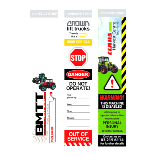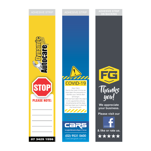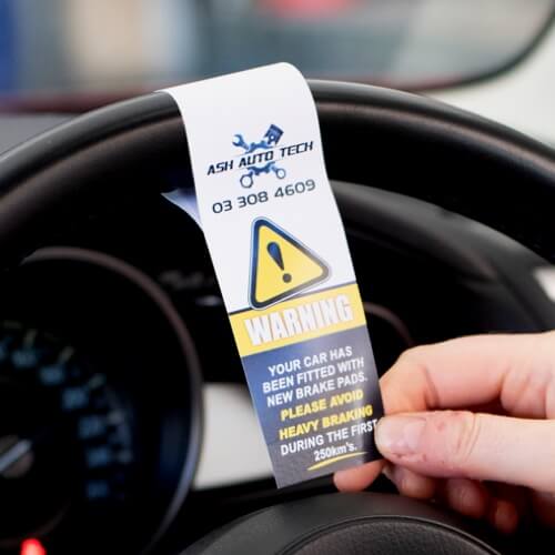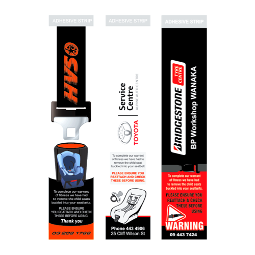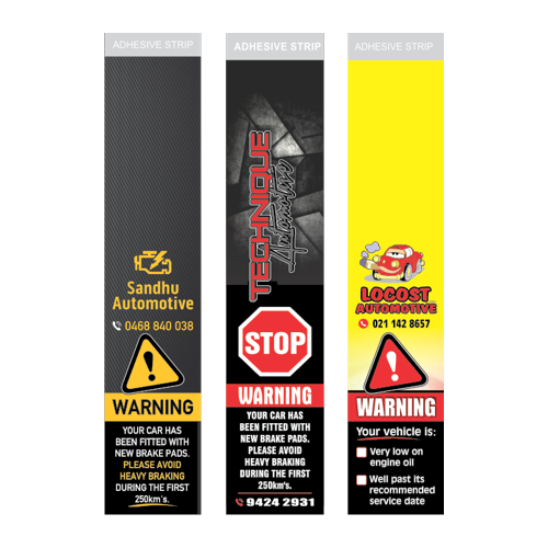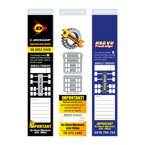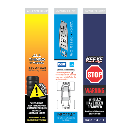 Existing warnings Include: Child car seat restraint, Wheel-nut torque, Brake adjustment, Operation warning etc. We can custom design these to suit your needs and ensure your butt is covered!